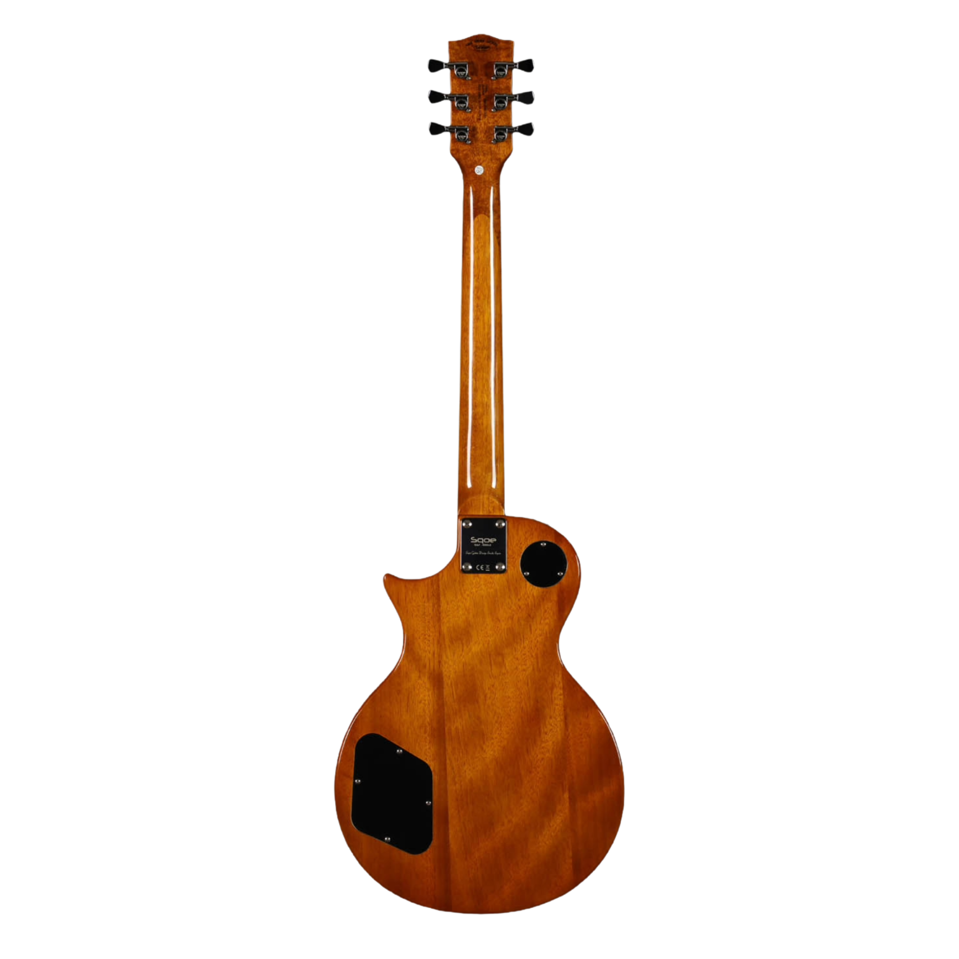 The SQOE SELP110 is a premium Les Paul–inspired electric guitar crafted for outstanding tone, smooth playability, and eye-catching looks. Built with a solid mahogany body and mahogany neck, it delivers the rich warmth and sustain that guitarists expect from a traditional LP-style instrument. The rosewood fingerboard with stainless steel frets ensures smooth playability and long-lasting durability, while dual Alnico 5 humbuckers provide versatile tones—perfect for blues, rock, or metal.