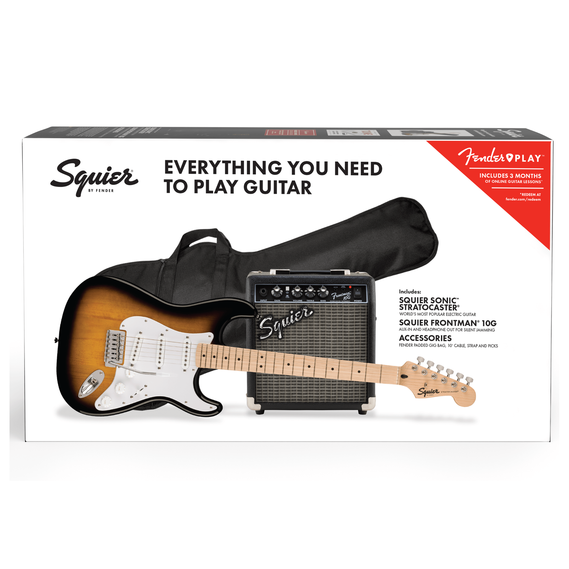 The Squier Sonic® Stratocaster® Pack is ready to launch any musical adventure into warp speed, offering new players a convenient collection of guitar essentials in one box. An icon of music history and a great choice for beginners, the Stratocaster is renowned for its stylish and comfortable contoured body and slim, easy-to-play neck. Three single-coil pickups produce inspiring and versatile tone perfect for any musical genre and a tremolo bridge invites expressive vibrato effects that are sure to spark creativity. The compact and portable Squier® Frontman® 10G amplifier features both clean and overdrive channels, two-band EQ for tone control, headphone jack for silent practice and an aux input for connecting a media device. Also included are a padded gig bag, instrument cable, strap and picks, as well as a free 3-month subscription to Fender Play® - the easiest way to learn guitar.